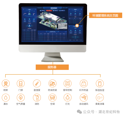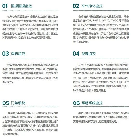 采集馆内的温度、湿度、空气质量等环境数据,实时显示、存储各馆区环境数据,下达各种控制指令,打开或者关闭空调、恒湿净化消毒一体机等设备。实现对档案库馆内的温度、湿度、空气质量等环境自动管理,并可以对数据进行综合分析。当馆区环境数据达到或超过预设含量值时,系统能自动告警,当告警发生时,如果在指定时间内无人处理,系统将自动按照与预先设置好的处理方法和步骤进行处理,并同时记录相关日志。