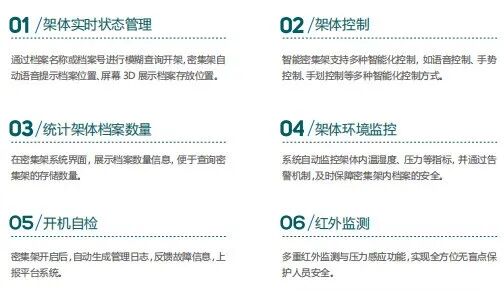 智能密集架管理系统具有架体实时监控、架体自检、操作日志、联动控制等功能于一体。通过获取架体的运行状态,并根据计算机或移动设备上的软件系统控制密集架的运行,可以设置密集架的存储目录信息,可以根据存放的档案开启密集架,实时显示架内温湿度情况以及密集架的状况等。以实现档案有序管理,提高档案管理效率,使档案管理更加安全智能。